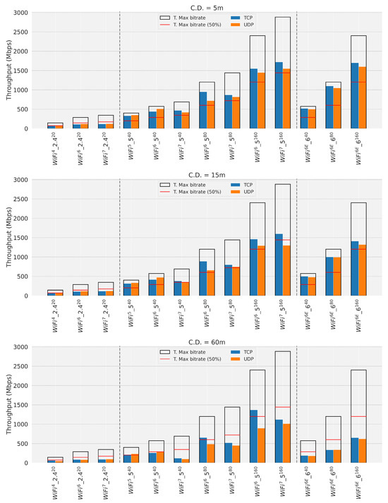 At long distances (CD = 60 m), WiFi_5 exhibited slightly lower performance than WiFi_5, with differences of approximately 80 Mbps in TCP and 50 Mbps in UDP. This indicates that the additional bandwidth provided by 80 MHz channels may help compensate for propagation losses, particularly in the 6 GHz band. The results confirm the significant improvements introduced by Wi-Fi 6 in challenging environments with obstacles. Although Wi-Fi 7 appears promising, its current performance appears to be influenced by early-stage implementations rather than fundamental technological limitations. Future tests with more mature devices and software updates could provide a more accurate assessment of their real-world capabilities.
