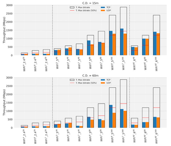 In this non-LoS indoor environment, tests could only be carried out at medium (CD = 15 m) and long (CD = 60 m) distances due to limitations in a factory undergoing digitalisation. Therefore, Figure 10 shows the experimental results obtained for TCP and UDP traffic.