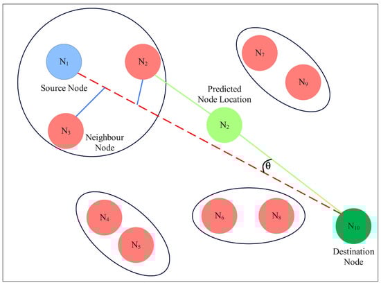 The selection of the next hop comprises three parameters: (i) the node’s movement stability, (ii) the node’s direction prediction, and (iii) the neighbor node distance from the LoS line between the source and destination (this distance is measured perpendicularly). The node’s stability () is related to the history table, which contains two parameters, namely the time and location of the node. Based on time and location information, the node by itself can calculate the average speed attained by it during the transition from one location to another. This provides insight into whether a node is stable or not in its movement. A high average speed shows the unstable movement of the node, while a low average speed shows that the node’s movement is stable. For node movement direction (), a Markov predictor can be applied, which can predict the next direction by analyzing the previous visit’s pattern [20,21]. Finally, the perpendicular distance () of the neighbor node from the source-to-destination line (SDL) is measured; this provides the closeness of a neighbor node to the SDL.