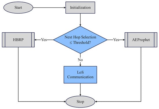 The proposed methodology is presented in Figure 2. In Figure 2, the network and assumptions of the routing protocols are initialized at the start. After that, the next hop is selected using a predefined utility matrix, such as the HBRP algorithm, or following predefined AEProphet algorithm steps to forward the data to the destination. However, these algorithms get activated after finding a suitable next hop. Since these algorithms fully rely on device-to-device (D2D) communication, there is the possibility of getting stuck waiting for the selection of the suitable next hop. Due to such hindrance, significant degradation in the average energy and overhead ratio can be observed, along with an increase in dead nodes. To tackle such hindrances, we proposed utilizing LoS communication. It is also important to note that if the next hop is selected before the threshold limit, then the existing routing protocols are utilized and no LoS communication is utilized. The purpose of LoS communication is to avoid long delays when existing protocols stall.