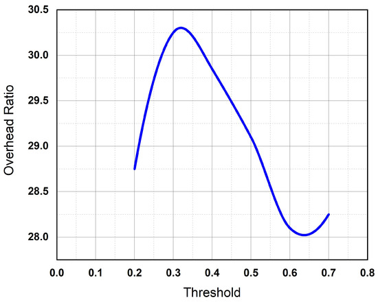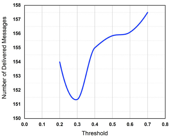Figure 4 shows the performance of the proposed methodology in terms of the overhead ratio compared to the threshold. Initially, the overhead ratio increases for threshold values ranging from 0.2 to 0.33 and then decreases until reaching a threshold value of 0.6. The increase in overhead ratio can be attributed to the lower number of delivered messages, which necessitates higher retransmissions of message packets. However, as the threshold values increase, the number of delivered messages also rises, ultimately leading to a reduction in message retransmissions and, consequently, a lower overhead ratio.