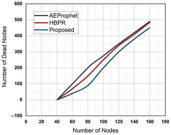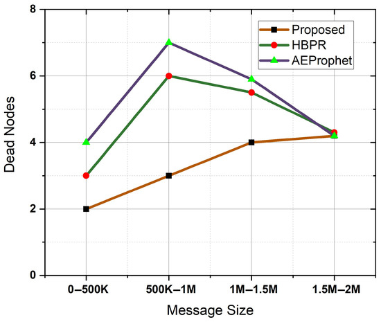Figure 8 illustrates the performance of the proposed scheme compared to existing schemes in terms of dead nodes versus message size changes. The existing schemes exhibit a higher occurrence of dead nodes as the message size increases, particularly within the range of 0 to 1.5 MB; meanwhile, the proposed scheme illustrates a lower number of dead nodes in the network. As the message size increases from a specific point, such as 1.5 MB, the proposed schemes show a rise in dead nodes, which could be attributed to higher message processing of the message, thereby increasing energy consumption.