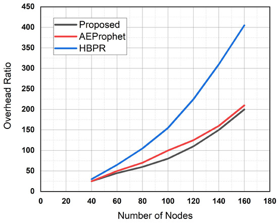 Figure 6 illustrates the performance of the overhead ratio parameters of the proposed scheme compared to existing schemes. The proposed scheme demonstrates a lower overhead ratio compared to the HBRP and AEProphet algorithms. The overhead issue remains minimal when the number of nodes is relatively small, specifically within the range of 40 to 80 nodes. However, as the number of nodes increases from 80 to 160 the HBRP algorithm exhibits an exponential increase in the overhead ratio, while the AEProphet algorithm maintains a lower overhead ratio. In comparison to both existing schemes, the proposed scheme consistently shows a lower overhead ratio across all node ranges examined in this study. This performance can be attributed to the incorporation of line-of-sight (LoS)-based communication, which minimizes delays in next-hop selection. Furthermore, the proposed scheme also performs excellently as the message size increases. It enhances the average energy efficiency by nearly 4% compared to the existing HBRP and AEProphet algorithms. The proposed scheme and AEProphet exhibit a similar overhead ratio, as both approaches employ comparable context-aware routing strategies that limit redundant message forwarding. However, beyond a certain threshold, the proposed scheme leverages LoS communication, which effectively reduces retransmissions and buffer load. This results in a performance divergence, with the proposed scheme demonstrating superior overhead efficiency.