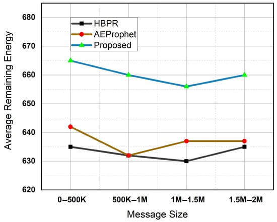 Figure 7 illustrates the performance of the average energy of the nodes for both the proposed scheme and the existing scheme, comparing average energy consumption against message size. The proposed scheme mitigates the issue of node congestion in selecting the next hop, ultimately leading to lower energy consumption. In contrast, existing algorithms consistently identify the next hop to forward the message to its destination, which can introduce delays. During the next-hop selection process, nodes must retain messages in their buffers while continuing to search for the appropriate next hop for forwarding. This reliance on redundant message copies in existing algorithms results in higher energy consumption, ultimately leading to a decrease in the average energy of the nodes. Conversely, the proposed scheme effectively maintains average energy levels, thereby ensuring a lower number of dead nodes.