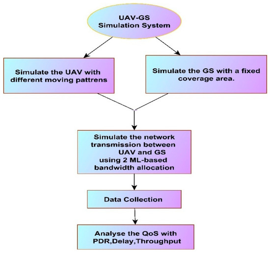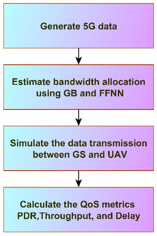 This work focuses on optimizing bandwidth allocation for 5G networks by employing machine learning models, specifically LSGB and the BRFFNN. Simulations are conducted to study data exchange between UAVs and ground stations, with movement patterns categorized into circular and random. The evaluation is performed using QoS parameters, including the PDR, delay, and throughput, to identify the most effective approach for improving network performance. Figure 1 shows the overall flow of the methodology.