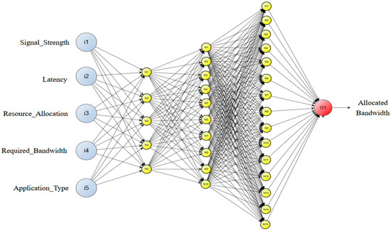 where represents the input variables and is the new input of the standardized variables, while are the mean and standard deviation [29]. The data used in this study consists of five main input categories, which are signal strength, latency, resource allocation, required bandwidth, and application type. The prediction output from the BRFFNN is the allocated bandwidth, as shown in Figure 2.
