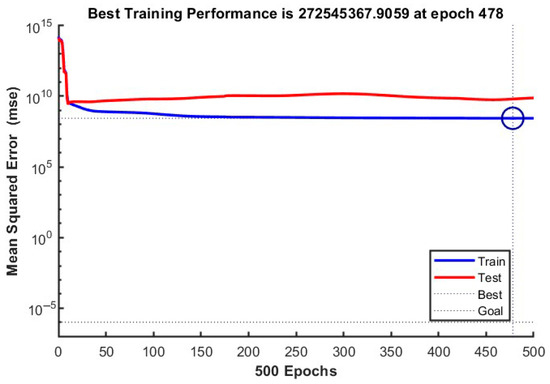 Training and validation loss (MSE) curves for the BRFFNN over 500 epochs using Bayesian regularization. The best training performance was achieved at epoch 478.