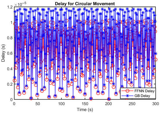 Delay using BRFFNN and LSGB for bandwidth allocation with circular UAV movement.