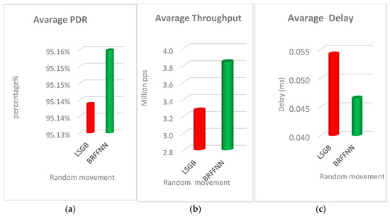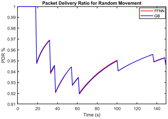 In scenarios involving random movement, the BRFFNN and LSGB models achieved an average PDR of 95.15% and 95.13%, respectively. These results indicate that the BRFFNN model slightly outperforms the LSGB model in maintaining higher packet delivery rates, showcasing its robustness in more dynamic conditions.
