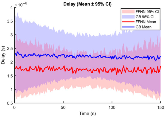 The results of mean ±95% CI for the PDR over a 150 s simulation period show that both the BRFFNN and LSGB maintain a consistently high PDR (~90–100%) across all time instances. For the data transmission delay, the result of mean ±95% CI is shown in Figure 13. The BRFFNN consistently exhibits lower delay (~1.5–2.0 × 10−3 ms) compared to LSGB (~2.0–2.5 × 10−3 ms). The confidence intervals for the BRFFNN are narrower, indicating more stable delay performance. LSGB delay values have slightly higher variability due to less precise bandwidth allocation.