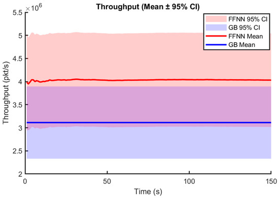 Figure 14 shows the mean ±95% CI of throughput in packets/second. The BRFFNN achieves higher throughput (~4.0–4.2 million pkt/s) compared to LSGB (~3.1–3.3 million pkt/s). The confidence intervals for the BRFFNN are more compact, showing stable bandwidth utilization, while LSGB shows slightly larger fluctuations.