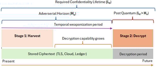 Figure 1 represents a timeline showing the temporal asymmetry of our HNDL threat model. Here, denotes the required confidentiality lifetime of protected data (the duration for which data must remain secret), while represents the adversary’s decryption horizon (the time until quantum or advanced computational capabilities enable retrospective decryption). Stage 1 represents the harvesting phase where adversaries collect encrypted data from various sources (TLS sessions, cloud archives, distributed ledgers). Stage 2 represents the decryption phase where stored ciphertext is retrospectively decrypted after quantum computational advances. The temporal phase from collection to decryption capability weaponizes stored data as a future liability. The compromise condition determines when confidentiality fails.