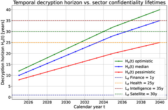 The fundamental principle of HNDL is that confidentiality fails when the required protection duration exceeds the adversary’s ability to decrypt. The temporal relationship can be stated simply: if data must remain secret for years, but the adversary can decrypt data harvested years in the past, then any data older than years is vulnerable. Therefore, confidentiality failure occurs when the required secrecy lifetime exceeds the adversary’s horizon . The gap between these two quantities is shrinking as advances in quantum computation reduce the time needed to break cryptosystems such as RSA and elliptic-curve cryptography [31,32]. Formally,