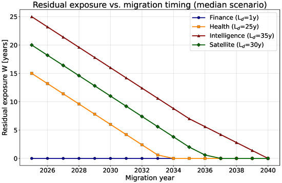 - Low-lifetime sectors: For Finance ( year), variations in have no impact as long as year, illustrating how short lifetimes naturally mitigate HNDL risk regardless of quantum timeline uncertainty.