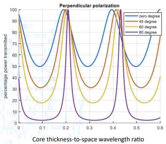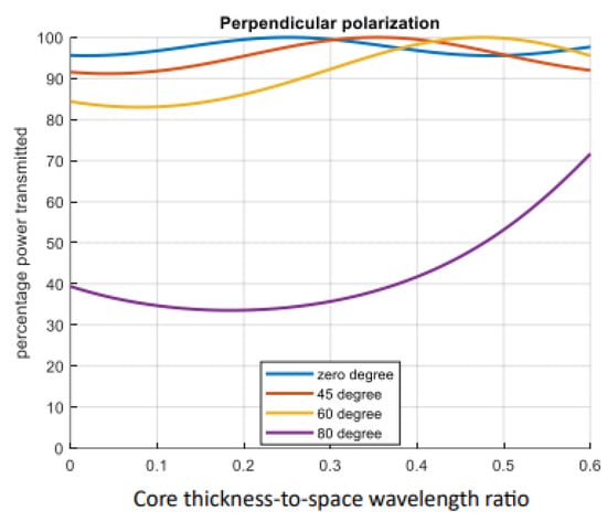 Power transmission with core. Dielectric constant = 1.15 for the fixed-skin dielectric constant (3.23) and thickness 0.03λ (0.957 mm); for perpendicular polarization.
