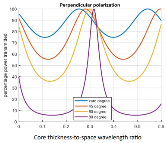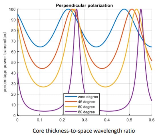 Power transmission with core. Dielectric constant = 4 for the fixed-skin dielectric constant (3.23) and thickness 0.03λ (0.957 mm); for perpendicular polarization.