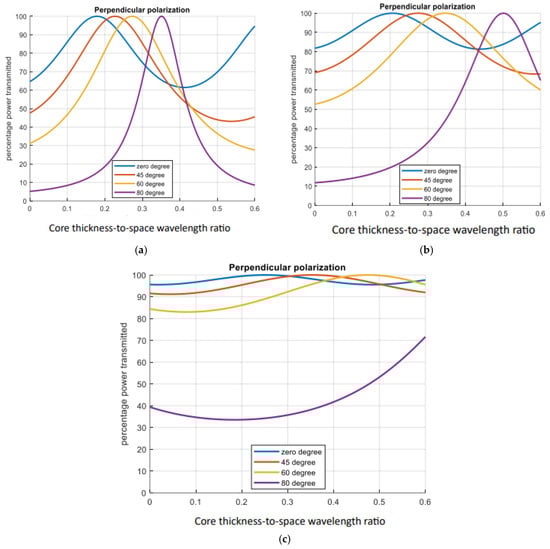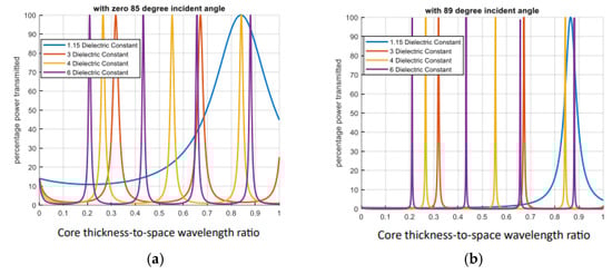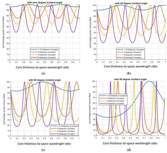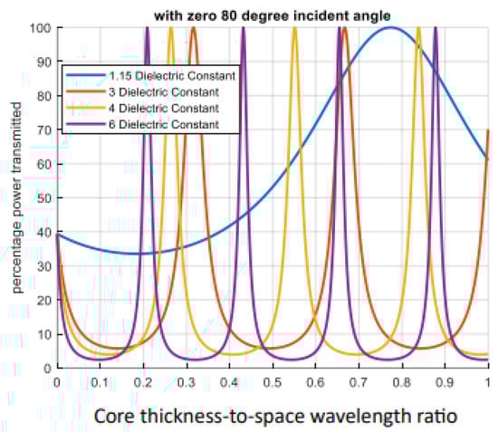 With reference to the radome design methodology [], the authors develop a synthesis to calculate numerically the optimum thickness for skin and core materials with relevant dielectric constant values. For this purpose, a MATLAB code is developed using Equations (1)–(7) to find the optimum skin and core thickness (satisfying perpendicular polarization transmission with various incident angles 0°, 45°, 60° and 80°) by varying dielectric constant values.