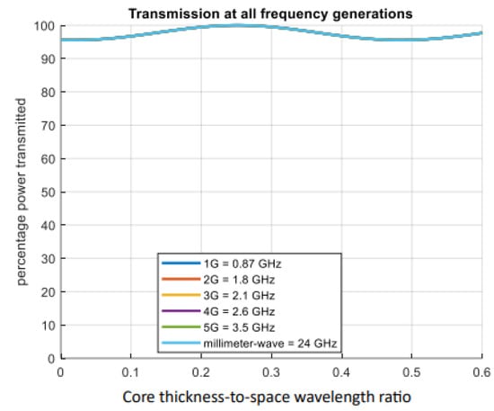 In the first step, transmission characteristics are shown for different core materials (with various dielectric constant values) keeping the skin thickness fixed (0.03 thickness-to-wavelength ratio, i.e., 0.957 mm []) at 9.4 GHz. The transmitted power is calculated numerically through a MATLAB code as a percentage for the core material by varying the dielectric constant value in steps (dielectric constant = 6, 4, 3 and 1.15) with the fixed-skin dielectric constant and thickness values for the incident angles 0°, 45°, 60° and 80° as shown in Figure 1, Figure 2, Figure 3 and Figure 4. It can be observed from the results that the transmission is better with a dielectric constant of 1.15 for the incident angles 0°, 45°, 60° and 80° for both of the optimization cases shown in Figure 4. This graph yields an optimum thickness-to-wavelength ratio of 0.304 (for perpendicular polarization). The dielectric cover is to be used for the antennas (designed with perpendicular polarization), so the optimum and ultimate core thickness is 0.304λ, i.e., 9.7 mm. In the second step, the skin dielectric constant value is varied (keeping fixed the optimum core with a 1.15 dielectric constant, 9.7 mm thickness and skin thickness of 0.03λ, i.e., 0.957 mm). It can be observed from Figure 5a–c that the optimum skin dielectric constant is 3.23 with a 0.957 mm thickness. It is clear from Figure 5c that the skin is satisfied with an optimum value of 0.304λ (9.7 mm) core thickness only with a dielectric constant of 3.23 and a fixed thickness of 0.957 mm. In the third step, the code is run each time for one fixed incident angle i.e., (0°, 45°, 60° and 80°) for various dielectric constant values of core material as shown in Figure 6a–d. It can be seen that the transmission remains good throughout the various thickness values for all incident angles at the optimum dielectric constant, i.e., 1.15. This exercise is performed at a central design frequency of 9.4 GHz. To check that the proposed synthesis can be applicable to all frequency spectrums, the code is run for various frequency bands (in microwave and millimeter-wave ranges) with the optimum thickness and dielectric constant values of a dielectric structure as shown in Figure 7. It is clear that the transmission remains the same and is unique throughout the axis when the code is run for various frequency bands with the optimum dielectric design values.