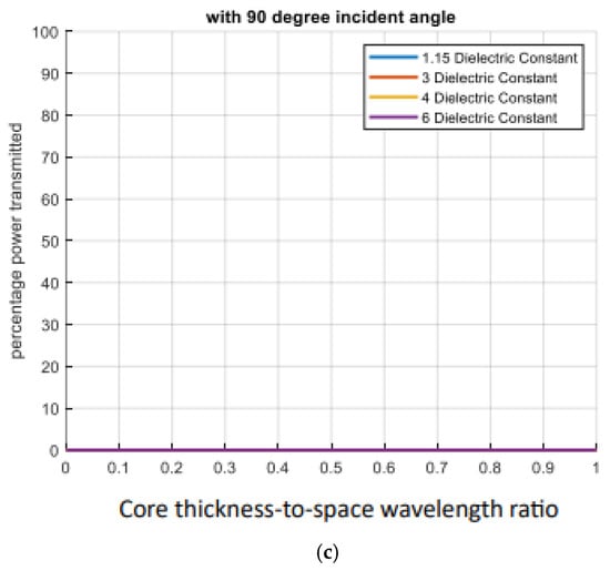 It can be observed from all of the above results that the dielectric material gives its maximum transmission at a specific thickness and dielectric constant value for different incident angles. This optimum point moves forward and is transferred to a greater thickness value as the dielectric constant value is decreased. Furthermore, only the optimum dielectric constant value covers the wide range of thickness bands to give a transmission efficiency near or above 90%, but the rest of the dielectric values give a high transmission efficiency for only one or two specific points with a sharp downfall. It can also be observed that there is a minimum thickness band for the 80° incident angle not only for the optimum case but also for all of other above-graph results. It can be seen from Figure 8 that transmission happened for only one specific and precise thickness point for all of the dielectric values except for the optimum (1.15 dielectric constant, which gives 100% (maximum) at one point but covers a thickness band with a lower percentage. When the code is run for three further increased incident angles, i.e., 85°, 89° and 90°, with this unique behavior of dielectric material, it can be observed that the thickness band becomes narrower and requires a precise and specific thickness but the optimum (1.15 dielectric constant) is moving forward as shown in Figure 9a,b. This behavior is confirmed until the antenna LOS (line of sight) disappears at the 90° angle as shown in Figure 9c.