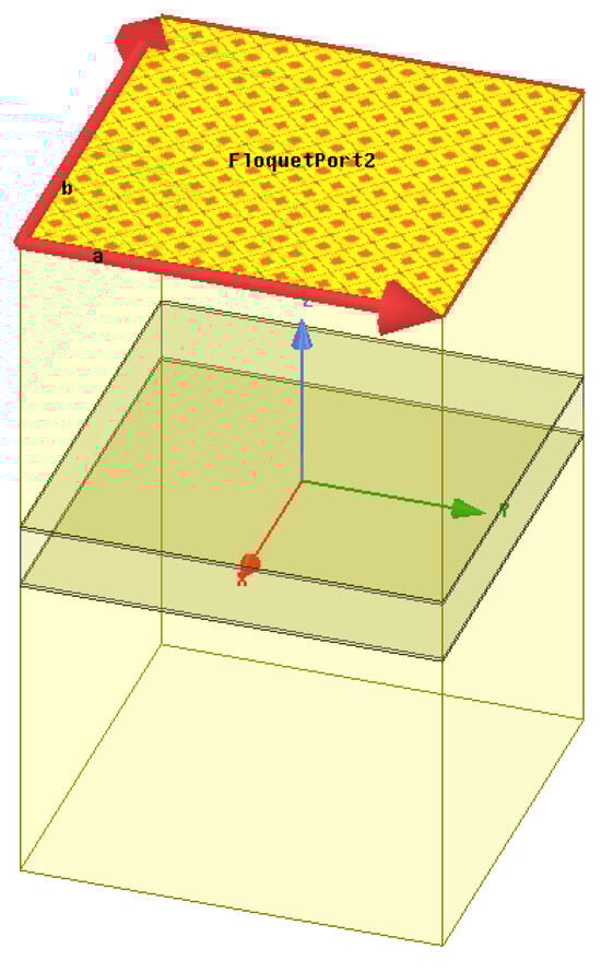 A floquet port analysis is performed with the optimum numerically calculated data for the dielectric core and skin materials for validation of the synthesis through simulation. A unit cell (measuring 60 mm × 60 mm as depicted in Figure 10) is simulated using the ANSYS 18.2 HFSS tool. For this purpose, this unit cell with a sandwich structure incorporates Quartz-polycyanate skin and Rohacell_110WF core materials, with respective thicknesses of 0.957 mm and 9.7 mm and dielectric constant values of 3.23 and 1.15, respectively. The Quartz has a base-material dielectric constant in the range of 3.78 to 4 for the frequency range 1 to 40 GHz. For the proposed structure, an optimized Quart-polycyanate composite is used with a dielectric constant of 3.23, dielectric loss of 0.002 δ, tensile strength of 1.75 GPa and softening point of 1600 °C. The Rohacell_110WF is a high-performance polymethacrylimide foam with a dielectric constant of 1.15, density of 110 kg/m3, tensile strength of 3.7 MPa, softening point of 350 °C and dielectric loss of 0.0003 δ.
