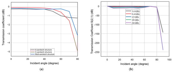 The transmission coefficient in Figure 11a shows a comparison for the transmission coefficient of various dielectric-sandwich structures (A-sandwich, C-sandwich and multi-layered sandwich). It can be observed that all three structures give a good transmission coefficient up to 60° incident angle with a little difference but A-sandwich makes a difference with better coefficient value beyond 60°. In the next step, the same analysis is performed with a selected A-sandwich structure for various randomly selected frequencies in microwave and millimeter-wave ranges at different incident angles as shown in Figure 11b. It can be seen that the dielectric A-sandwich structure with the numerically calculated optimum parameters gives good transmission coefficient for the incident angles 0–80° for each of mentioned frequencies. Hence, an optimum A-sandwich dielectric package is made with the optimum design parameters (flat or radome-shaped).