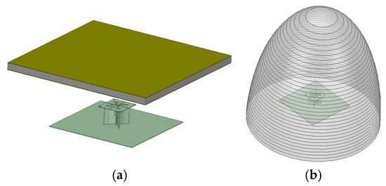 A millimeter-wave antenna under dielectric-layered protective structures: (a) antenna under a dielectric-layered straight panel structure and (b) antenna under a dielectric-layered radome structure (bottom radius = 160 mm, middle layer radius = 140 mm and top layer radius = 36 mm).
