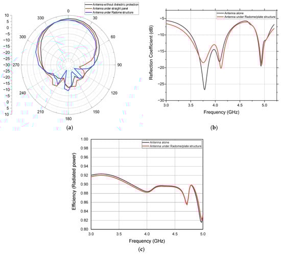 A sub-6 GHz 5G antenna shown in Figure 12 is simulated. This antenna covers the frequency bands of 3.6–3.85 GHz, 4.05–4.2 GHz and 4.8–4.95 GHz with S11 and S22 values below −15 dB. The antenna is tested under both dielectric-layered protective structures (radome and plate) as depicted in Figure 12. The antenna performance parameters (gain, bandwidth, efficiency and HPBW) are observed as shown in Figure 13. The simulated radiation patterns, reflection coefficient and antenna efficiency, with and without the dielectric-layered structures, are given in Figure 13. It is evident that the antenna without dielectric protection exhibits a slightly higher peak gain value of 7 dBi compared to the other cases. Interestingly, even with the introduction of dielectric protective structures, the gain remains consistent at 6.85 dBi. Additionally, the radiation patterns for all three scenarios are remarkably similar, and are characterized by an equal half-power beamwidth (HPBW), i.e., 65° but a slight beam-squint towards the left side. Consequently, the impact of reflections from the dielectric materials are relatively minimal. Similarly, a slight upward shift of S11 and the efficiency graph are observed without affecting the gain value and resonance frequency as shown in Figure 13b,c. For the S11 parameter, the graph pattern shifts a little upward for the first two bands due to the dielectric surface reflections. Despite this, the overall efficiency graph follows the same pattern for the frequency sweep within the specified bands, including a little reflection for the dielectric structure scenario as shown in Figure 13c.