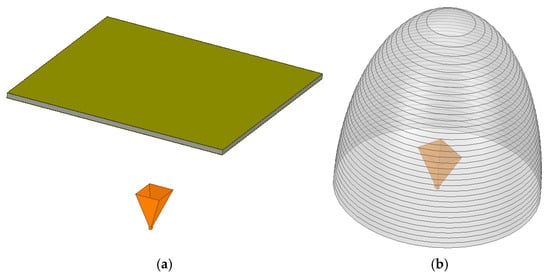 X-band horn antenna under dielectric-layered protective structures: (a) antenna under a dielectric-layered straight panel structure, (b) antenna under a dielectric-layered radome structure (bottom radius = 160 mm, middle layer radius = 140 mm, top layer radius = 36 mm and height = 350 mm.