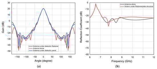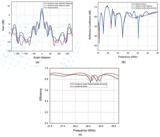 A substrate-integrated H-plane printed-horn antenna is simulated at 28 GHz under both dielectric structures as shown in Figure 16a,b. It is a low-profile novel structure antenna that gives a large continuous bandwidth in the millimeter-wave frequency range. The antenna alone gives 8.8 dBi of simulated gain with a 20 to 45 GHz large impedance bandwidth. It can be observed from Figure 17a that the antenna exhibits a total of 8.75 and 8.70 dBi in simulated gain under the dielectric panel and radome, respectively. This result confirms the optimal transparency properties of the dielectric structures even at frequencies higher than 20 GHz. Furthermore, a reflection coefficient and radiation efficiency graph are shown in Figure 17b,c. A small variable reflection is observed throughout the frequency sweep but a minimal reflection is observed at the resonance/design frequency.
