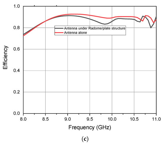 A WR-90 horn antenna operating in the X-band range, with a design frequency of 9.4 GHz, is simulated under two dielectric structures, as illustrated in Figure 14a,b. The antenna demonstrates a significant impedance bandwidth starting at 9 GHz and beyond. Moreover, the antenna alone achieves a simulated gain of 20.23 dBi at 9.4 GHz, as depicted in Figure 15a. When placed under a dielectric straight panel (measuring 600 mm × 600 mm) and a radome, the antenna exhibits simulated gains of 20.20 dBi and 20 dBi, respectively. It has been observed that directional antennas experience minimal reflection compared to isotropic antennas. Consequently, the impact of the dielectric packaging on the antenna pattern is minimal. Moreover, the S11 parameter and radiation efficiency graphs are also given in Figure 15b,c. A small variable reflection is observed through the frequency sweep within the specified band that does not impact on the peak gain value at resonance frequency. The impact of much of the reflection is observed on the side lobes and back lobe of the antenna gain (radiation) patterns as shown in Figure 13a and Figure 15a.
