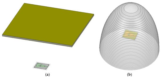 5G antenna under dielectric-layered A-sandwich protective structures: (a) antenna under a dielectric-layered A-sandwich straight panel (200 mm × 200 mm) structure and (b) antenna under a dielectric-layered A-sandwich radome structure (bottom radius = 160 mm, middle layer radius= 140 mm, top layer radius = 36 mm and height = 320 mm).