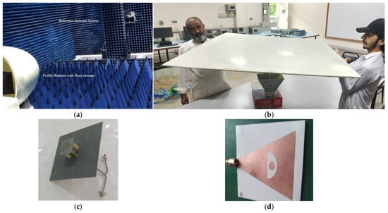 In the first step, the prototypes of dielectric-layered radomes and plate structures along with different microwave and millimeter-wave antennas are realized and shown in Figure 18. In particular, the dome structure of the proposed dielectric radome (Figure 18a) is mostly used for airborne applications while the plate structure (Figure 18b) is favorable for ground applications mostly. They both have been realized and tested. The different antennas have been placed under these dielectric structures to measure radiation patterns. Moreover, Figure 18a shows the measurement set-up, where the profile dielectric structure is fixed along with an X-band profile antenna as the receiver antenna system. The reference antenna system of the anechoic chamber is used to check/test the profile receiver antenna system. So, the gain pattern of the profile antenna system that is under a profile dielectric cover is measured. All antennas are tested in the same way.