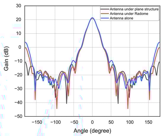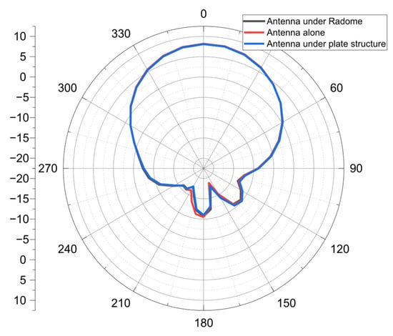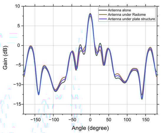 In the final step, a fabricated H-plane directional millimeter-wave antenna is tested under the prototype of the dielectric-layered structures, and the results have been measured. This is a substrate-integrated H-plane printed horn-patch directive antenna. In this case, the radiation pattern in Figure 21 shows a small difference in the peak gain value and a small upward shift in the side lobes and back lobe caused by the dielectric surface of the structures. The measured gain of the fabricated antenna under the dielectric plate structure and antenna alone is 8.67 dBi, while it further decreases to 8.64 dBi for the plate structure.