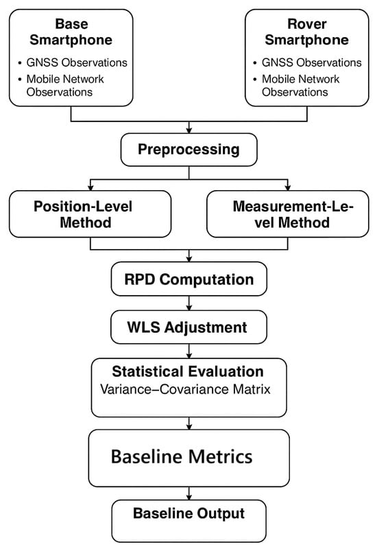 Since direct access to the internal databases of mobile network positioning servers is not permitted for end-users, these APIs provide the only available interface for accessing and analyzing network-assisted geolocation information. The raw data collected through these interfaces were processed using DGNSS to evaluate the precision of the mobile network positioning. During the observed time, the coordinates (latitude, longitude, and altitude) and accuracy values are recorded simultaneously, one epoch at a time. Both apps operate in the background without interrupting each other. The base and rover receivers do not exhibit correlated noise; in other words, their variances are independent, since the phones are physically separated by a short baseline and exposed to different environments. We implement the RPD algorithm to estimate the base–rover baseline. Figure 2 outlines the pipeline, which includes preprocessing, position-level and measurement-level branches, RPD with WLS, and statistical evaluation. Full details are provided in Section 2.1 and Section 2.2.