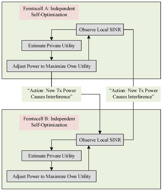 The noncooperative game-theoretic approach conceptualizes power control as a selfish optimization problem, wherein each player (e.g., a femtocell) independently strives to maximize its own utility. As depicted in Figure 1, this model entails a decentralized process where nodes make decisions based on local data. The interaction of nodes occurs indirectly through mutual interference in a shared environment rather than through explicit communication. This foundational principle, which was pioneered in early work on distributed algorithms using local SINR measurements [35], highlights the lack of coordination among players. Later, the authors in [36] proposed iterative water-filling algorithms for Gaussian interference channels, which served as a basis for noncooperative strategies.