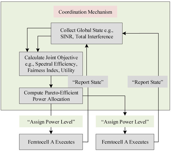 Cooperative game theory establishes a framework for collaboration among network entities to achieve a common goal, such as maximizing total throughput or minimizing aggregate interference. This approach, illustrated in Figure 2, involves base stations coordinating their power allocation to optimize network-wide performance [40]. The system dynamics paradigm is particularly useful for modeling the feedback mechanisms and emergent behaviors in such coordinated systems, providing a holistic view of cooperative control in 5G networks [41,42]. However, these studies also underscore a critical trade-off that must be managed: balancing the pursuit of maximum throughput with the imperative of ensuring fairness among users [40,42].