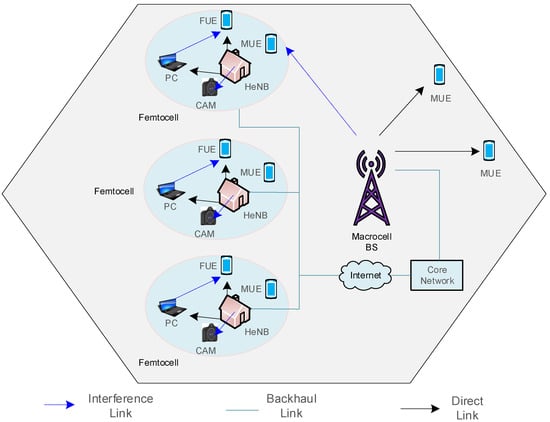 Implementing LTE-A and 5G wireless communication standards introduced extreme densification of small cells placed at convenient points by end users. This results in small cells deployed within the existing cells’ footprint area. Figure 3 illustrates a typical scenario of macrocell and small-cell deployment. The discussion and further analysis will refer to small cells as femtocells. Historically, the primary component of cellular networks has been the macrocell, a base station type designed for large-scale coverage using high transmission power and antennas mounted at significant heights.