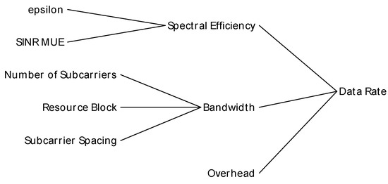 The determination of peak data rates—for both uplink and downlink transmissions—in a 5G NR system is governed by its baseband capabilities, with the selected modulation and coding scheme (MCS) and the count of MIMO layers being primary factors. The data rate (Rs), in a band or band combination, for a given number of aggregated carriers is approximated by Equation (6) as follows [59]: