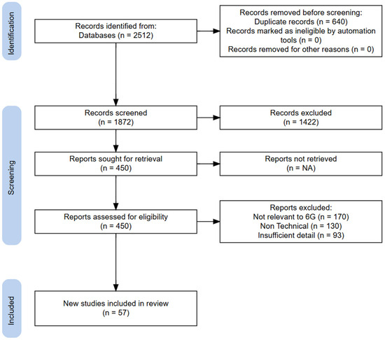 The database search initially identified 2512 records. After removing 640 duplicates, 1872 records were screened based on their titles and abstracts, of which 1422 were excluded. The full texts of the remaining 450 articles were assessed for eligibility. Of these, 393 were excluded for reasons such as not being directly relevant to 6G (n = 170), being non-technical in nature (n = 130), or lacking sufficient detail (n = 93). Ultimately, 57 sources met the inclusion criteria and were included in this scoping review. The full PRISMA-ScR flow diagram [4] is presented in Figure 1.