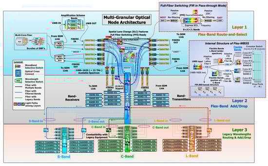 Layer 2 relies solely on an Inter-Band Optical Cross Connect (OXC) which can manage and receive/forward bands (or portion of bands) in a Colorless/Directionless/Contentionless manner (C/D/C) [1] from/to the local band-transceivers. Blue lines from the West ingress WBSS direct the selected flex-bands to the OXC (L1D in Figure 1), which can either assign each dropped band to an available band receiver (L2D in Figure 1) or pass through the selected flex-bands to another degree (L2P in Figure 1), either to improve the traffic management or/and to provide enhanced redundancy and resilience. Similarly, the blue lines from the OXC to the East/South egress WBSS represent additional paths for signals originating from band-transmitters, with the reconfiguration association performed by the OXC. For clarity, other blue connection lines are omitted. Finally, the lowest hierarchy, Layer 3—(Legacy Wavelengths Access for Routing and Add/Drop), ensures compatibility with legacy equipment such as C-band transmission systems. Bands S, C and L, which require wavelength access, are configured via conventional WSS interfacing with an Intra-Band OXC. This setup supports routing and/or wavelength add (L3A in Figure 1) or drop (L3D in Figure 1) to single-channel transceivers. The choice for passing individual wavelengths through the node to another degree is another option too (L3P in Figure 1). As wavelength access is expected to be phased out gradually, resources at this layer can be decommissioned over time and replaced by scalable elements of Layer-2 (e.g., WBSSs, band-transceivers).