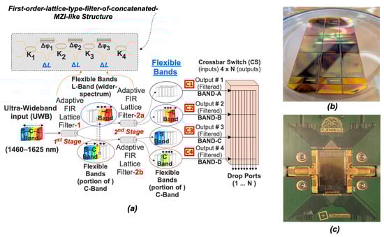 The novel MG-ON architecture aims to address the transition from current wavelength switching to future Full Fiber Switching through an intermediate step to Waveband Switching, as it is compatible with all these technologies. It incorporates PIC-based, state-of-the-art flex-WBSSs comprising features such as reduced size footprint, low insertion losses (few dB), and fast switching (found to be in the range of 10 microseconds when utilizing piezo actuators on silicon nitride waveguides) combined with a low-cost signature. The expected crosstalk suppression is roughly ≥23 dB at the output. The internal WBSS structure depicted in Figure 2a incorporates two adaptive filtering stages implemented with cascaded optical FIR lattice filters (Figure 2a, inset) [21,22], where k1–k4 represent the coupling coefficients, Δφ1–Δφ3 represent the tunable phase shifters and ΔL segments indicate the optical path length differences between the two arms of each MZI stage. These filters can split the incoming traffic into one up to four flexible disjoint bands. After this stage, the bands are routed to a 4 × N non-blocking crossbar switch (CS) which directs each band (or portion of it) to a designated output port.