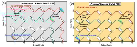 The proposed crossbar switch utilizes tunable couplers, which are implemented as single-stage MZIs with equal arm lengths. One arm of the MZI incorporates a phase actuator, enabling the formation of a coupler with a variable coupling ratio. When the input light enters the MZI, it is split into two arms. By adjusting the phase in one of the arms, the interference upon recombination at the output can be controlled to be either constructive or destructive. This phase-tuning capability allows the input signal to exit the MZI through either the bar port, cross port or a combination of both, contingent upon the specific phase adjustment applied. The internal structures of (4-input/N-output) CS for two different implementations are depicted in Figure 4. The conventional implementation features an array of inputs connected to an array of outputs, typically arranged in rows and columns (see Figure 4a). At each intersection of these waveguides, an MZI is positioned. To create an association between each input and output, the intersecting MZI is adjusted to redirect the input signal, which travels through the horizontal waveguide to the designated output on a vertical waveguide. In this configuration, most switches are set to the cross-state, while the switch that establishes the connection is set to the bar state (see Figure 4a). In our proposed CS design (in Figure 4b), we invert the logic at each intersection. This approach requires the most MZIs set to the bar state and complements the operation with a waveguide crossing. When a traffic flow enters the CS from input port 1, it can be seamlessly switched to any one of the N = 6 output ports just by configuring the adjacent tunable couplers (which are set to either bar or cross-state). So, the signal in the CS may pass through one crossing (minimum, blue line in Figure 4b, best-case scenario) up to 3 + N crossings (maximum, red line in Figure 4b, worst-case scenario). Although standard MZIs exhibit polarization dependency, recent PIC-based designs [16] have demonstrated polarization-independent implementations using either polarization diversity structures or integrated polarization beam splitters. Furthermore, crosstalk suppression (currently ~ −25 dB) can be further improved by optimizing phase-tuning resolution and utilizing multi-stage filtering with higher extinction-ratio DCs.