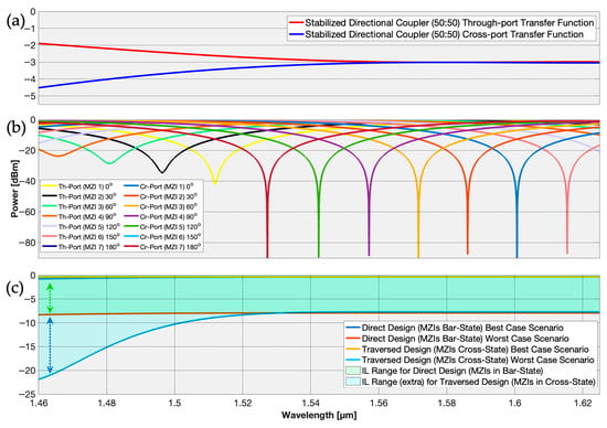 The signal in the CS may pass through from 1 crossing up to 3 + N crossings and varies with specific wavelength. The average IL is calculated upon all cases (from best to worst), for all (four bands) and then divided by eight (two paths for each band). Optimal performance of both components (FIR and CS) necessitates precise 50:50 power splits, which can be achieved using stabilized DCs (Figure 5a). The IL of lattice filters, as noted earlier, is a function of the number of taps used. This number is an a priori parameter normally set by the node designer. Typically, the CS’s switches are set to the cross-state (except for the selected intersection switch which is set to bar state). However, conducted studies in [1] revealed that the bar state has a slightly better performance than that of the cross-state. So, it is preferable to invert the state of CS’s switches and finally set most MZIs at the bar state and use a waveguide crossing at each intersection (see Figure 4b) to achieve an improved CS performance. So, if a waveguide crossing shows better performance than a DC, then this method turns out to be beneficial. Waveguide crossings, in general, do not create significant crosstalk, but they result in low values of IL. As a result, this method introduces a trade-off between crosstalk and IL. In any case, we must take into consideration that crosstalk is the most critical performance metric. Figure 5a depicts the performance of a coupler with stabilized DCs (50:50); Figure 5b shows the simulated output of a single lattice stage (unitary transformation with tunable coupler, MZI delay and tunable coupler) set to 50:50 power splits and a varied delay phase to scan the notch frequency. Figure 5c shows the performance of a 4 × 19 CS for two separate designs: direct (MZIs in bar state) and traversed (MZIs in cross-state).