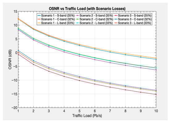 Figure 6 illustrates the OSNR and the corresponding traffic load—ranging up to 10 Pb/s—across various switching scenarios and flexible transmission bands (S-, C- and L-bands) of the MG-ON.