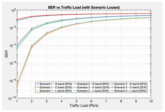 On a logarithmic scale, the BER shows increasing error rates as traffic load rises, driven by OSNR degradation (due to linear and nonlinear effects discussed above). Scenario-based curves highlight the influence of loss profiles and traffic allocation schemes on BER across S-, C- and L-bands under three switching policies: Full Fiber Switching (FFS, Scenario 1), Waveband Switching (WBS, Scenario 2) and Wavelength Switching (WS, Scenario 3). As shown in Figure 7, the BER increases with higher traffic loads due to cumulative impairments. Comparing individual bands’ performance, the S-band has the highest BER, the L-band achieves moderate values and the C-band achieves the lowest BER among all bands. Comparing different switching scenarios’ performance, Scenario 1 (FFS) has the lowest BER (ranging from 10−9 to 10−2), while Scenario 2 (WBS) achieves moderate BER values (ranging from 10−5 to 10−2). Finally, Scenario 3 (WS) has the highest BER (10−2 to 10−1) due to greater losses. At higher loads (e.g., 9–10 Pb/s), differences in BER across bands and scenarios become less pronounced.