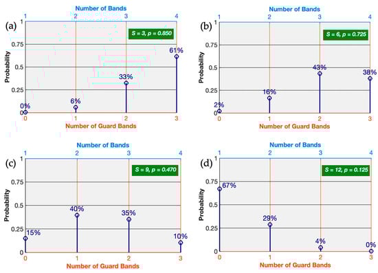 Probability distributions (p) of the number of bands (top x-axis) and the corresponding number of guard bands (x) (bottom x-axis, up to n = 3) under the binomial distribution, for different values of (S): (a) S = 3, (b) S = 6, (c) S = 9 and (d) S = 12.