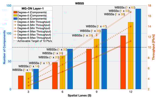 On the horizontal axis we evaluate spatial lanes (S) ranging from 3 up to 12 for varying degrees of connectivity (D) = 4, 5, 6 simulating a small-, medium- and large-scale node, respectively. The left vertical axis indicates the number of required components while the right vertical axis evaluates the achievable throughput (ingress traffic to MG-ON node). Results show that increasing the number of spatial lanes leads to a rise in both the number of components and the achievable throughput. For example, a small-scale node with S = 3 and D = 4 needs the deployment of 24 1 × 11 WBSSs and achieves a throughput of minimum ~2.63 Pb/s to maximum ~2.71 Pb/s. A medium-scale node with S = 6 and D = 5 requires the deployment of 60 1 × 26 WBSSs and reaches a throughput of ~6.64 Pb/s up to ~6.75 Pb/s. Finally, a large-scale node with S = 12 and D = 6 requires 144 1 × 62 WBSSs and delivers a throughput of roughly ~16.70 Pb/s up to ~16.78 Pb/s. The achievable target of 10 Pb/s or higher is attained with a D equal or greater than 5 at S = 9, reaching approximately of ~10.14 Pb/s to ~10.36 Pb/s necessitating the deployment of 90 1 × 38 WBSSs.