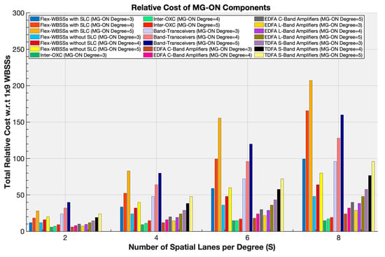 Consequently, as the number of WBSSs required for implementing MG-ON scales varies, the overall power consumption of the node due to the control unit scales differently. Figure 14 illustrates simulation results for power consumption of the corresponding MG-ON in terms of the number of spatial lanes (S) and degrees of connectivity (D) across the different layers of MG-ON simulating small-, medium- and large-scale node deployments. Table 3 shows the power consumption of MG-ON components across the two layers that were used for our simulation studies.