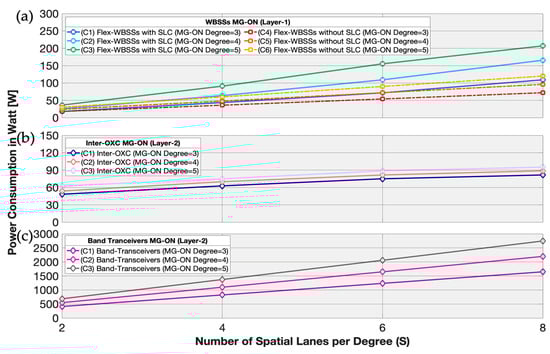 Power consumption of control unit of (a) WBSSs with and without (SLC), (b) Inter-OXC and (c) band-transceivers needed for realizing SDM nodes for three different MG-ON network scales (D = 3, 4, 5), with varying numbers of Spatial Lane Changes (S = 2, 4, 6, 8).
