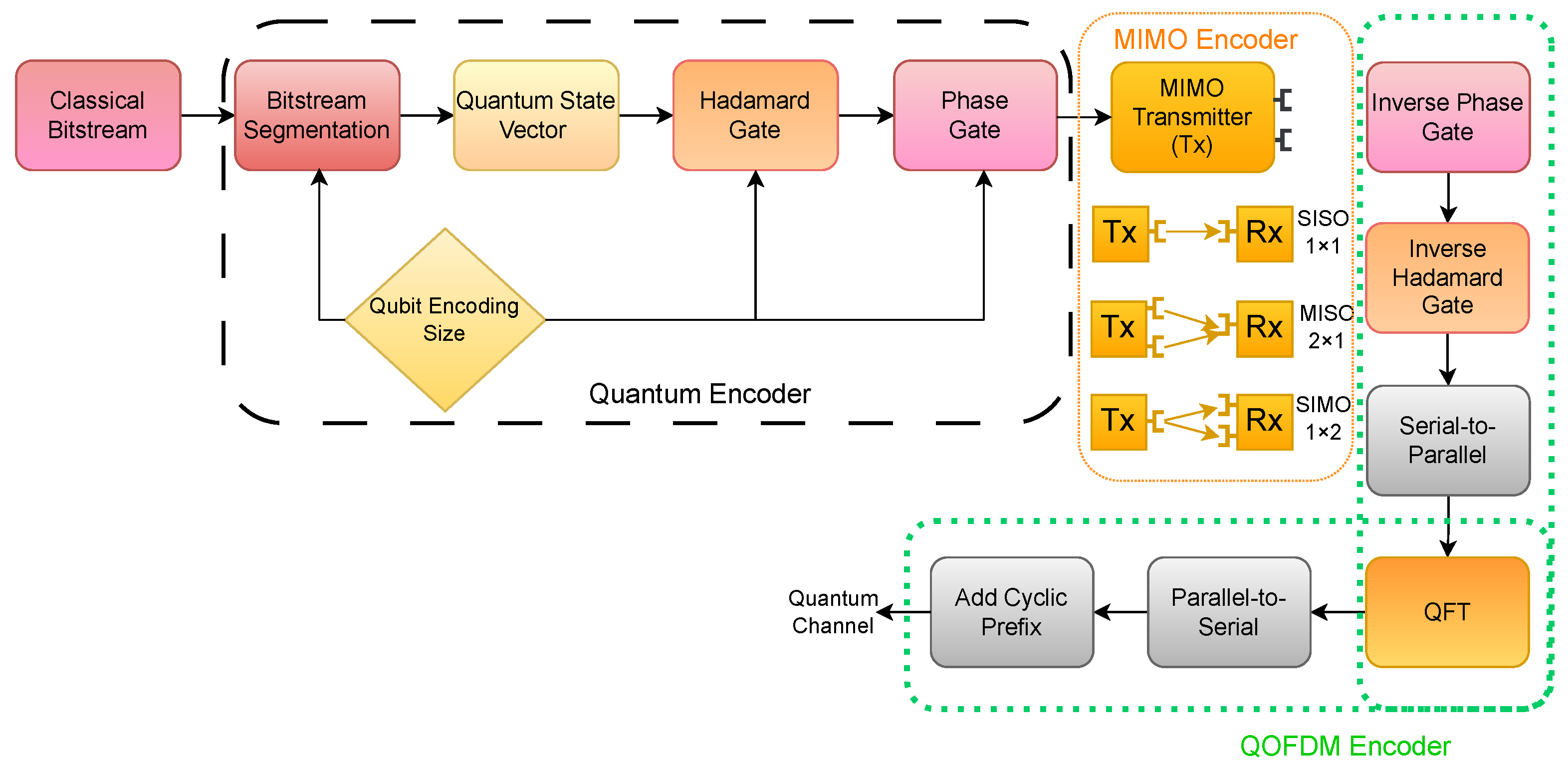- Design of a multi-qubit quantum encoding scheme integrated with quantum MIMO-OFDM modulation to enhance spectral efficiency and robustness.